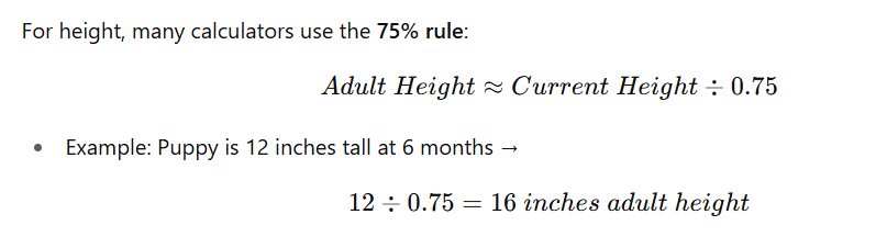 The calculator applies formulas that breeders and veterinarians often use to project growth. For medium and large breeds, the four-month doubling rule is common: a puppy’s weight at 16 weeks is roughly half of its adult weight. Toy breeds, however, grow faster, so the six-week multiplier (weight × 4) works better for them. For giant breeds, slower growth means using extended multipliers across several months. By blending these formulas with breed averages, the calculator avoids relying on only one method. This ensures the estimate adapts to different size categories and growth speeds, giving owners a realistic outlook.