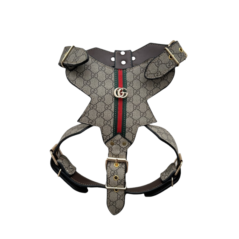 Pawcci Rockstar GG Monogram Gray Designer Leather Dog Harness & Leash Set for Dogs